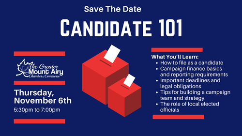 Join us for the 2025 Candidate 101 at the Surry County Service Center in Dobson. This is event is hosted in partnership with the Surry County Board of Elections and the Chamber's Public Policy Committee.